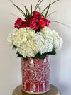 valentine arrangement in red and white scrolling lotus temple jar