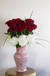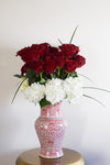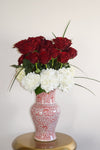valentine arrangement in red and white peony trumpet vase